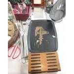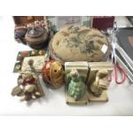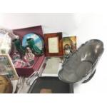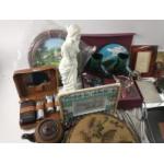 A mixed box of mainly decorative items to include a little brown teapot, a cloisonne ashtray with birds of paradise, barbecue tools, plus much more