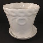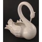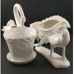 Collection of white pottery planters and white pottery ornament. To include Pereiras pheasant ornament (L: 33cm approx) chip on tail, Swan anter by Raimar ( H: 29cm approx), Maryleigh Pottery conch shell planter (W: 31cm approx) and weave design planter (W: 19cm H: 17.5cm approx) with saucer