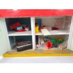 A VINTAGE dolls house c1970's with some basic furniture - will require some tlc - front door missing - two sections of the front which open out - dimensions 59cm long x 29cm depth x height 40cm