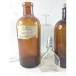 Five APOTHECARY bottles to include 2 clear glass with no labels (36cm high), one clear glass no labels, no stopper (25cm), one brown bottle (29cm, no stopper), from Liverpool labelled COMPRESSED TABLETS, one brown bottle no labels (29cm) plus a vintage CUSENIER liqueur bottle with aluminium drinking cap