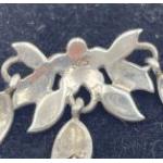925 stamped Art Deco style leaf pendant (W: 2cm) with pear shaped amethyst drop and marcasite settings on a 925 stamped silver chain (L: 42cm approx)