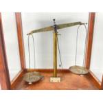 An antique glass cased SCIENTIFIC SCALES in mahogany case with slide-up window with a small drawer with turned handles and balance scales - came from a Scottish Agricultural College originally - dimensions 40x46x38cm