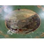 An ANTIQUE large oval hand-painted tinplate SERVING TRAY with a lake and mountain castle-top scene with gold laurel-wreath effect decor - dimensions 64cm x 50cm approx - came from a Scottish Borders Country Estate home