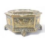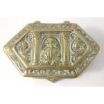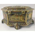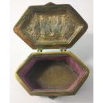 An antique six sided and lidded pink velvet lined REPOUSSE box depicting a rural manor house and a c17th century figure of a man (in style of Shakespeare) to include panels of coats of arms on raised feet - dimensions 12.5cm length x 7cm depth x 6cm height approx