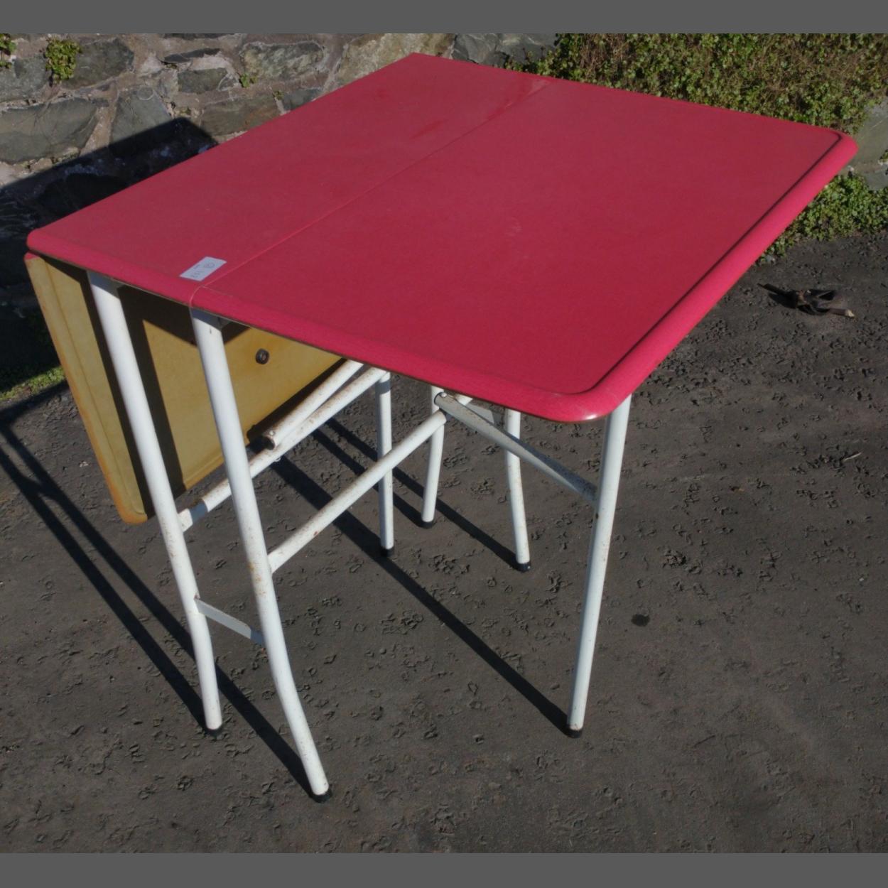A RETRO small drop-leaf red formica dining table with white tubular leg supports - 2ft x 3ft when extended approx
