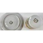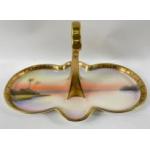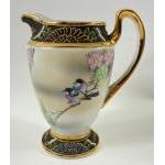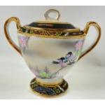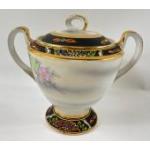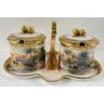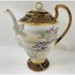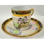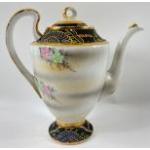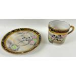 An ORIENTAL MIKONI coffee service with pink and green blossoms and heavy gilt trim comprising 1 coffee pot, 1 lidded sugar bowl, 1 milk jug, 6 demi-tasse cups, 6 saucers plus a single-handed NORITAKE tray with 2 lidded conserve jars with a Middle Eastern scene with a dhow and a man on a camel
