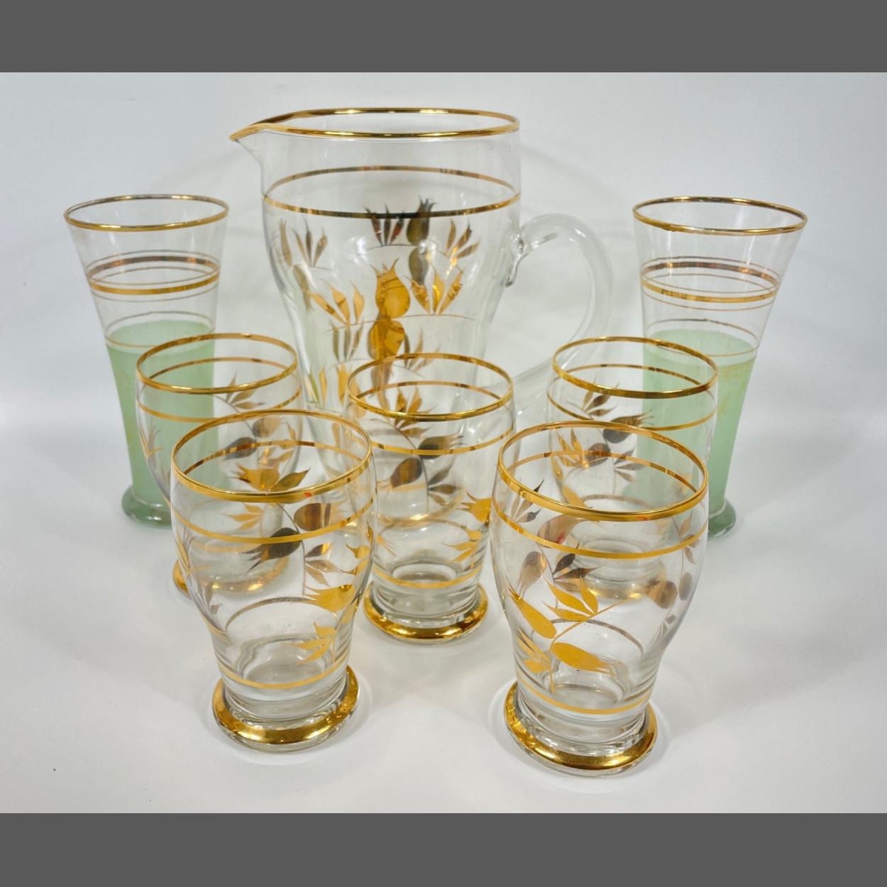 A retro pitcher and glass set with 5 glasses with a gilt tulip design plus 2 pilsner glasses