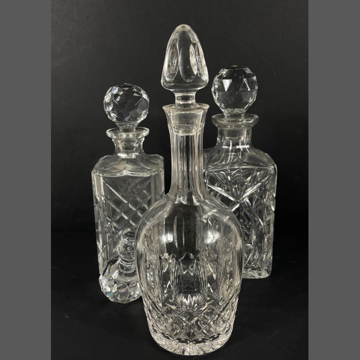 Two heavyweight whisky decanters (19cm and 16cm tall) plus one for sherry (31cm tall), and an extra stopper