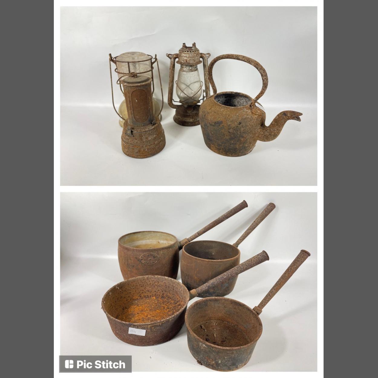 Ready for upcycling - new homes for bewildered birds or 4 strikingly original metal plant holders including a vintage soup pot by THOMAS SHELDON & Co Ltd (20cm dia x 16cm high) and a large kettle also by THOMAS SHELDON (30cm tall), also 2 well-weathered oil lamps and a vintage NOBBY2 - POWELL & HAMMER - No 552 paraffin heater