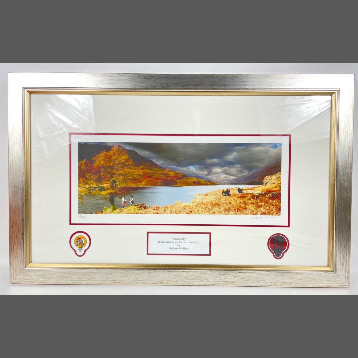 A signed-in-pencil limited edition of TRANQUILITY (Clan MacGregor by Loch Lomond) by GRAHAM WALLACE frame size 68x59cm, visible size 47x17cm