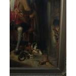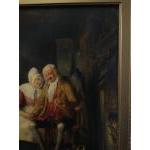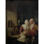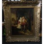 A 19th century IMPOSING Scottish School oil painting, no artist signature, in our opinion in the style of William Kidd HRSA Scottish | Circa 1790 - 1863 , oil on canvas Scottish Country Scene circa 1830's of an elderly couple sitting by the fireside, frame size 93 x 81cm, visible canvas 66cm x 53.5cm, the gesso frame needs some repair (but most has been saved within a separate bag)