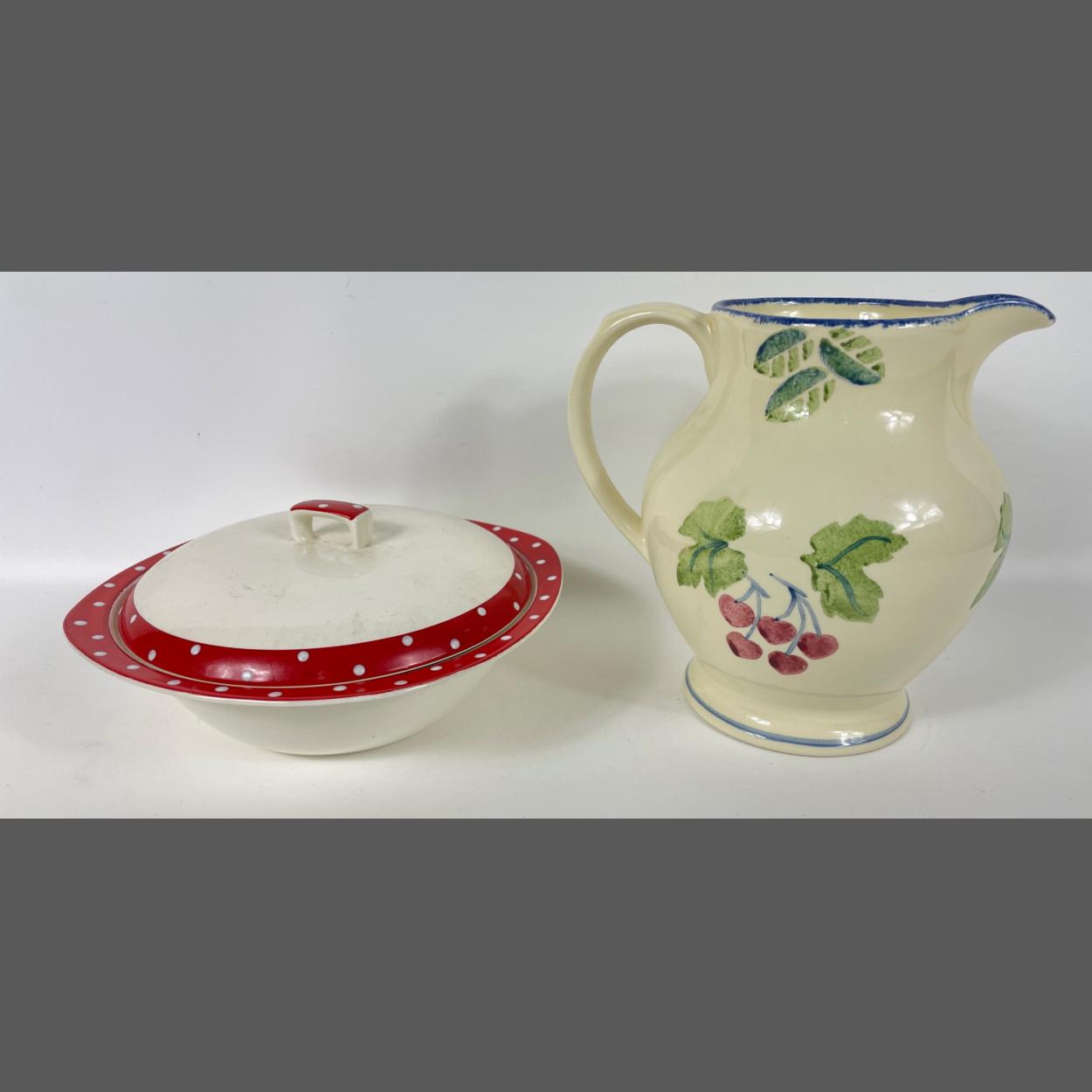 A large POOLE jug 20cm tall and a STYLECRAFT by MIDWINTER lidded vegetable dish with a red polka dot rim 22x7cm