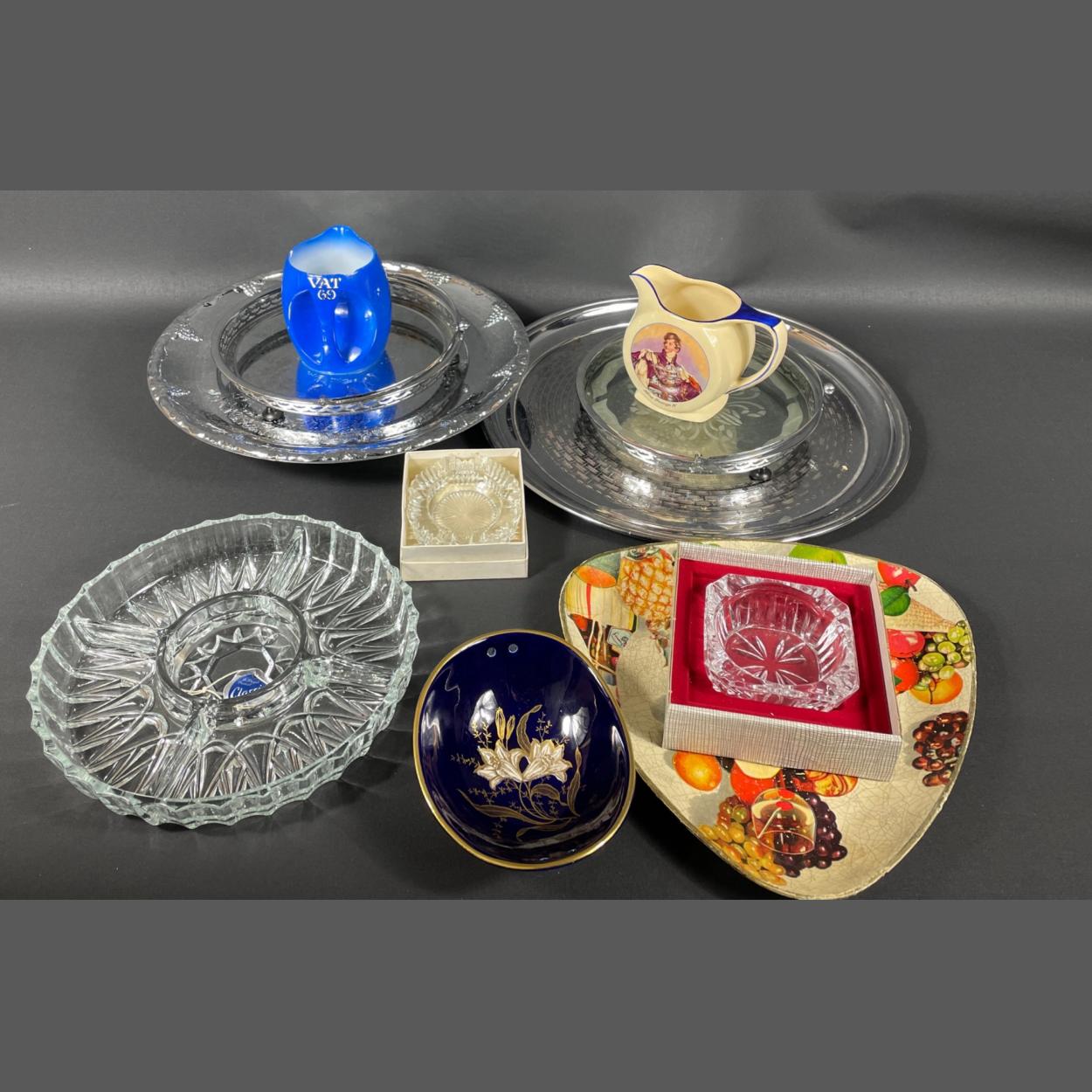 Be ready for your next party with this wide selection of serving dishes and platters to include a QUEEN ANNE silver plated tray,various hors d'oeuvres divided trays including by TWINCO, CRISTAL D'ARQUES ashtrays, King George IV whisky water jug