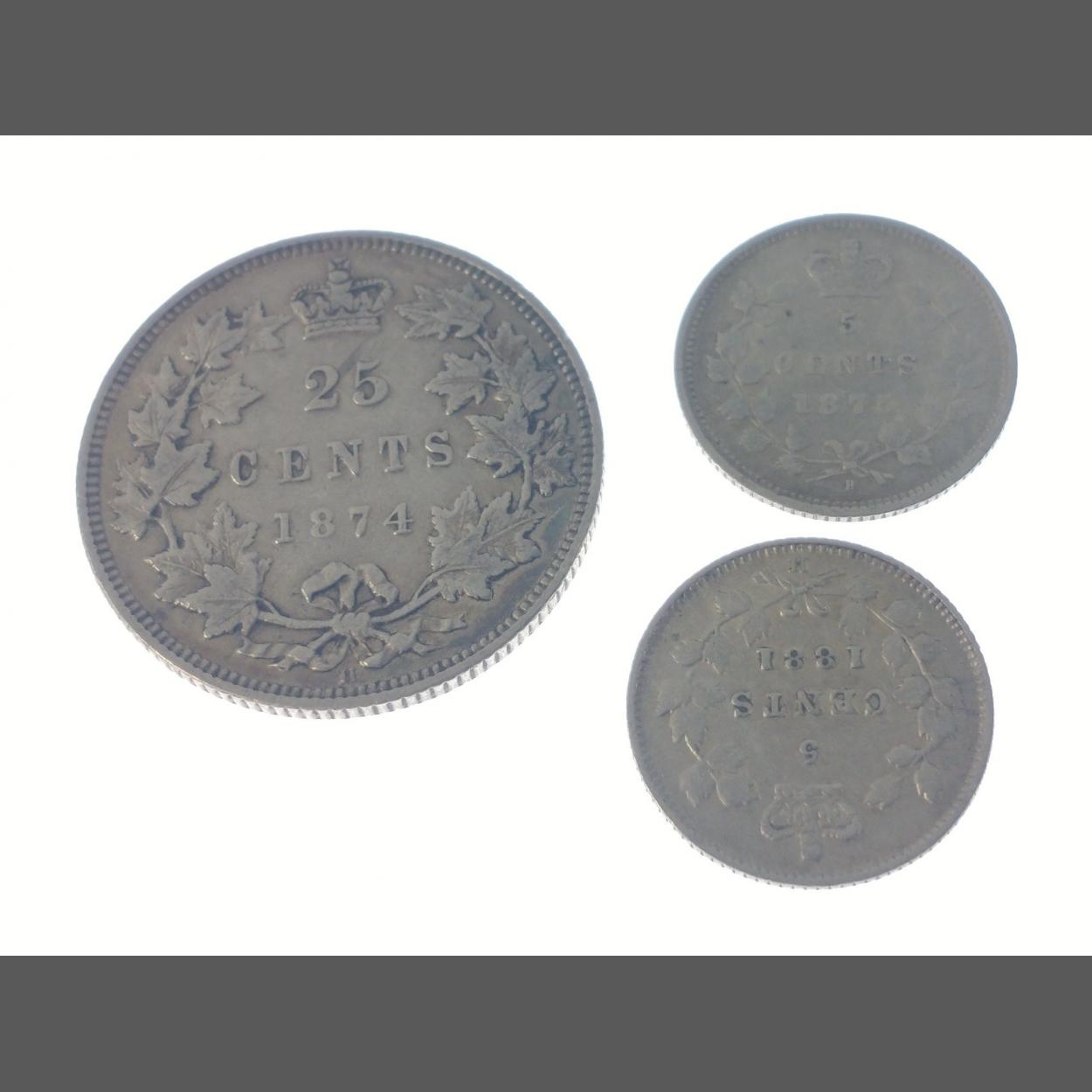 A collection of three silver coins to include. VICTORIA 1874 SILVER Canadian 25 Cents coin and two 5 cents VICTORIA 1883 and 1881 5 cents Canadian coin