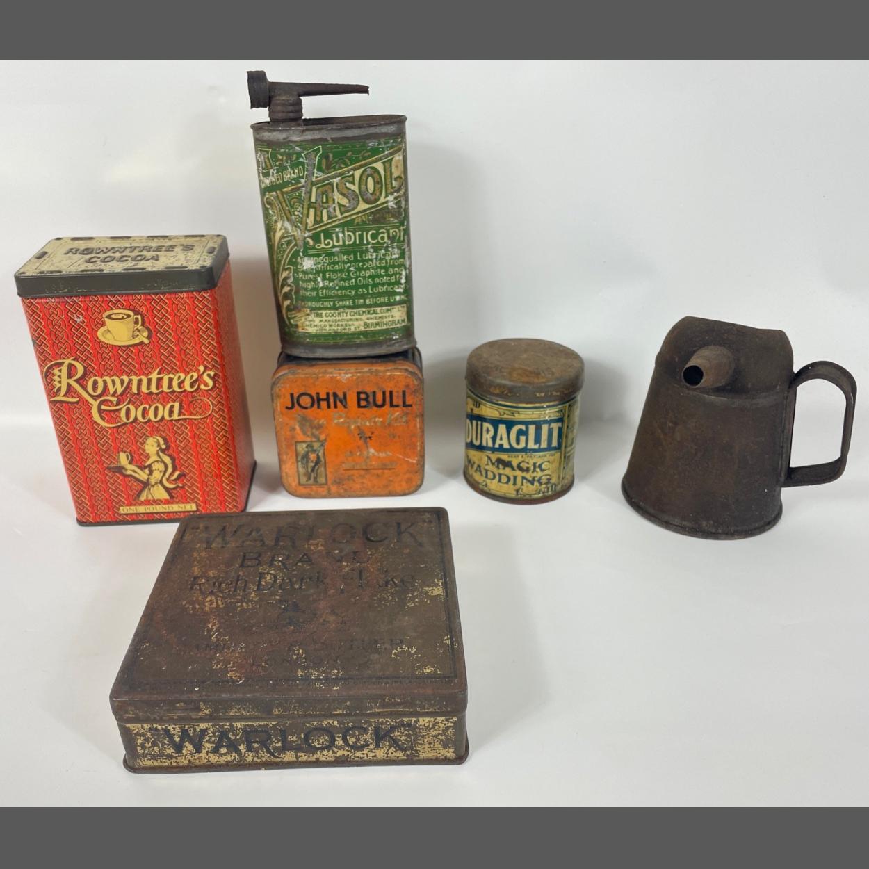 A VINTAGE collection of old well known brand tins to include VASOL lubricant 13cm height approx, a one pound net weight tin of ROWNTREES COCOA 15cm height, a JOHN BULL small tin 8cm square, , WARLOCK Brand tobacco tin 12cm square approx, DURAGLIT 'Magic Wadding' 8cm height and lastly a nice wee oil top-up can 12cm height approx