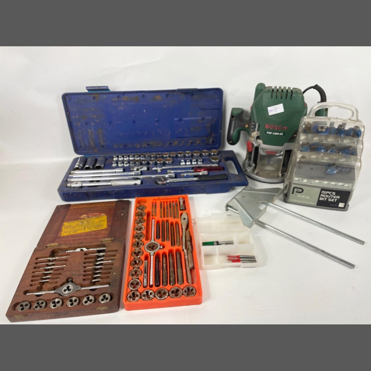 A box full of vintage tools to include garden shears, a tap and die boxed set, a BOSCH electric router POF 1200 AE and a box of router piece etc set