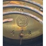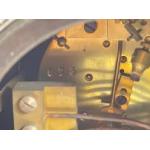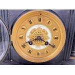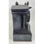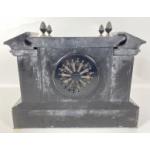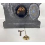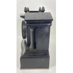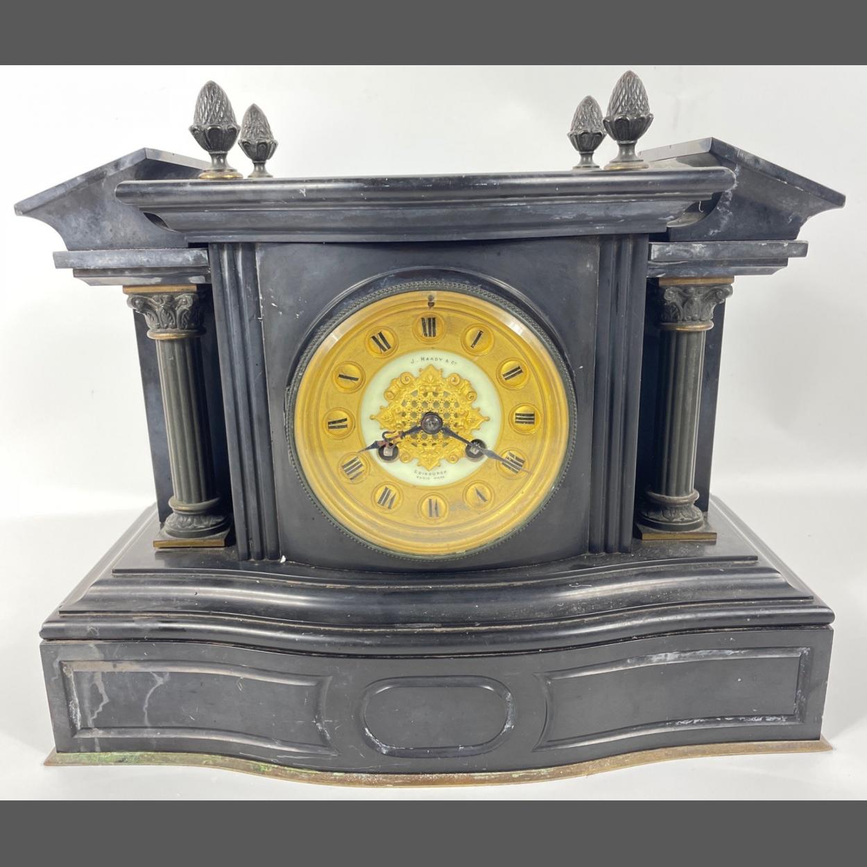 A vintage slate mantel clock with a mechanism by J HARDY & Co of EDINBURGH, stands 26cm high, 36cm wide, missing finial