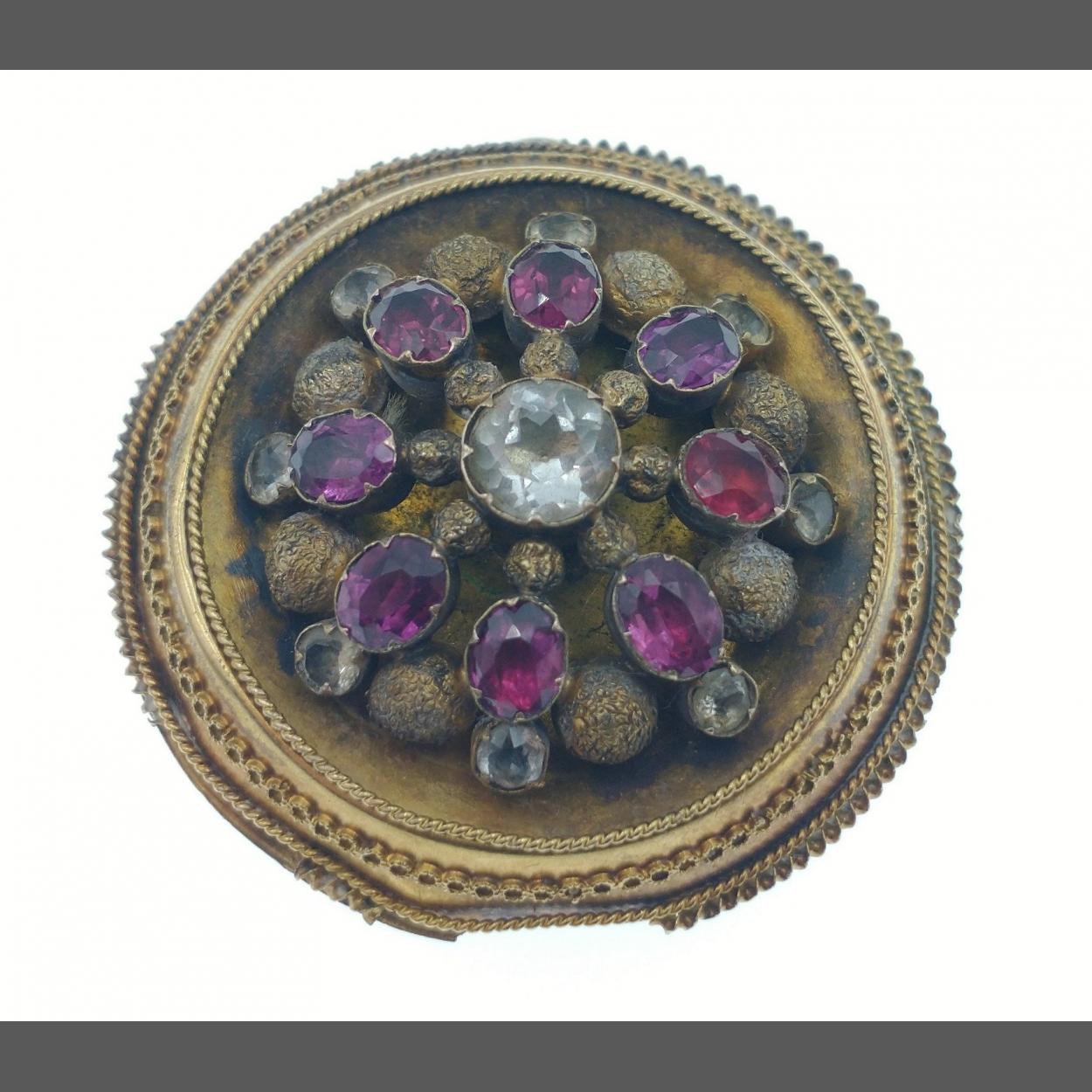 A VINTAGE c1890's 'yellow metal' brooch with amethyst style stones, one being replaced at one point - alas the brooch is damaged with the loss of it's pin! - 4cm dimaeter approx - see pics