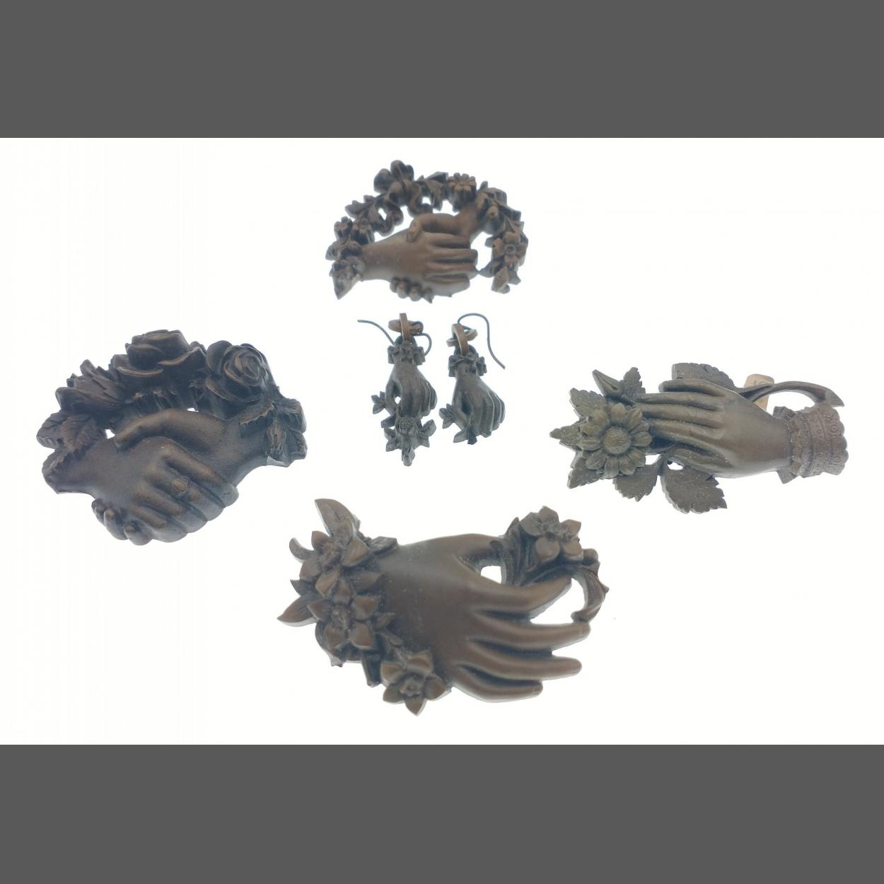 A collection of FOUR Antique Victorian hand brooch, pin. brownish vulcanite style hand carved mourning brooch, hand or hands holding flowers, jewellery - largest piece is 5cm in length - also a matching pair of hand earrings holding a small bouquet of flowers, one of the bouquets has come away damaged, but the part is still with the earring requiring a simple repair.