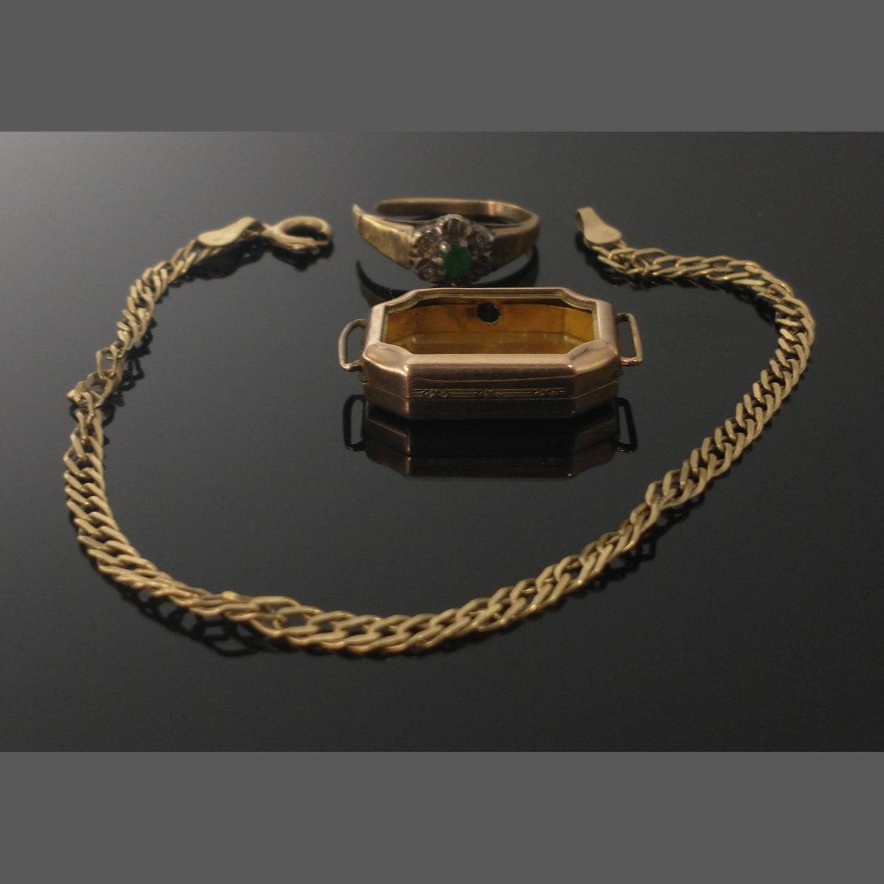 A quantity of scrap 375 yellow gold to include a small chain stamped 9kt weight 1.85g, a 375 stamped empty wrist watch case weight 1.30g and a broken ring with green and white stones which has been cut through by a jeweller potential Hallmark weight gross 1.42g approx