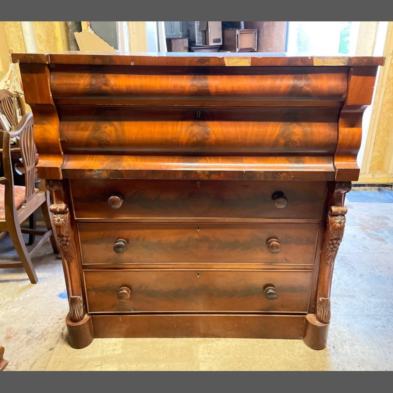 A VICTORIAN two over three drawer chest of drawers with UNUSUAL Carved mouldings of grapes etc on each side and original wooden knob handles - dimensions 4ft long x 2ft depth x height 5ft approx