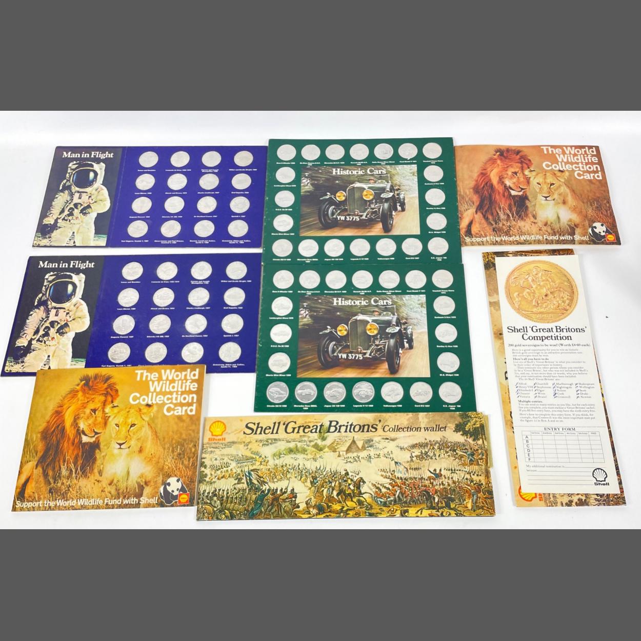 Vintage SHELL PETROL collections to include 2 complete sets of the 3D World Wildlife Collection Cards, 1 complete and 1 part-set of the 'Great Britons' Fine Art Prints, 2 complete sets of Historic Cards and 2 complete sets of Man in Flight