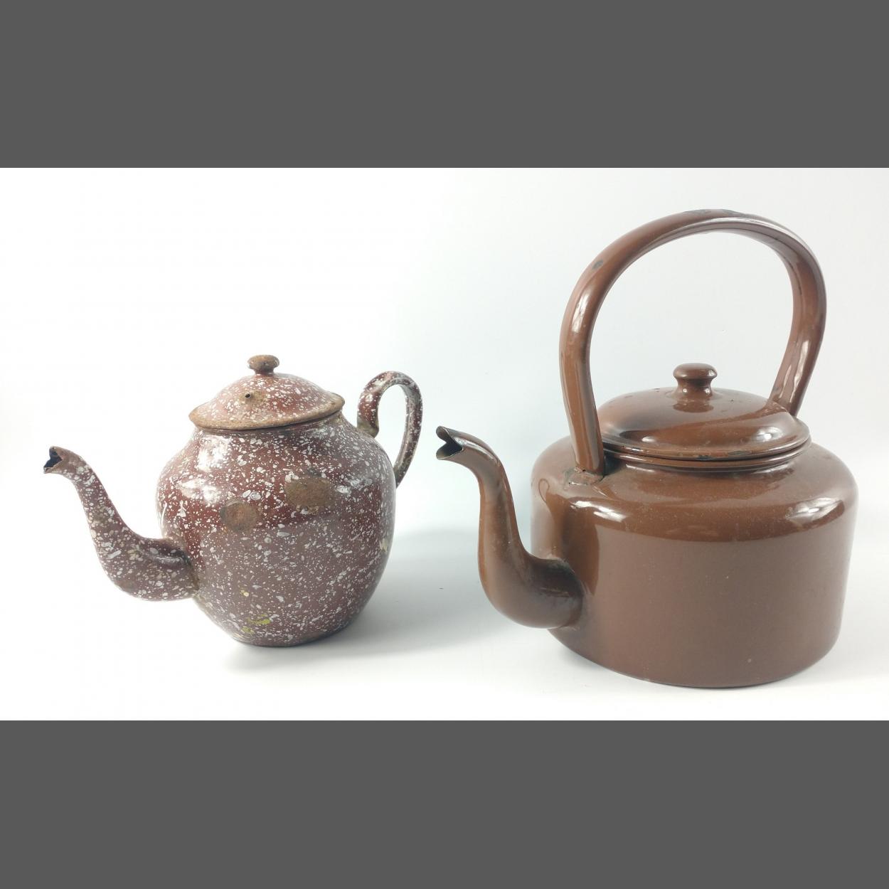 Add some real character to your kitchen with this brown enamel kettle, and an elderly brown speckled metal teapot