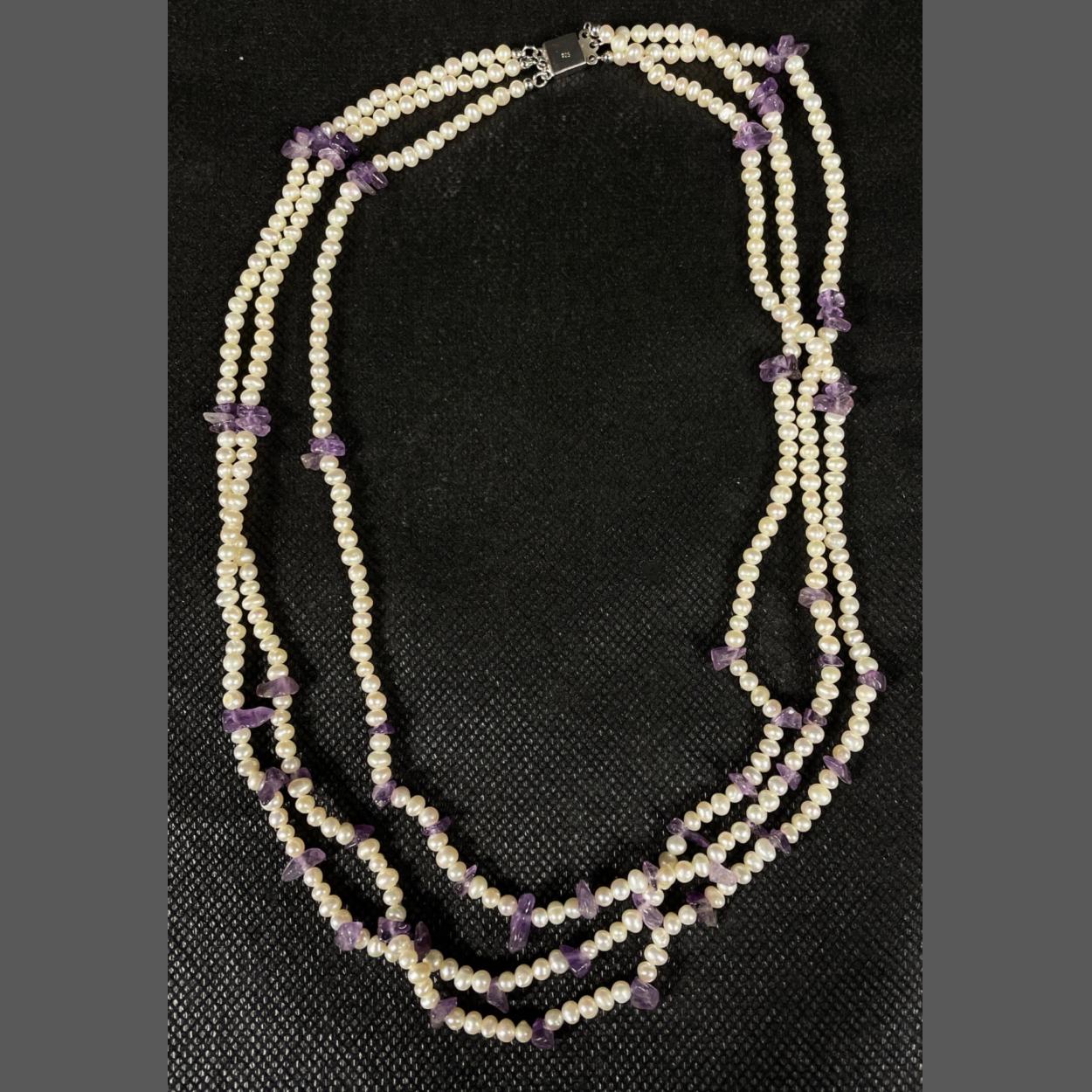 A 925 silver clasped 3 string small pearls with natural amethyst chips spacers 44cm long