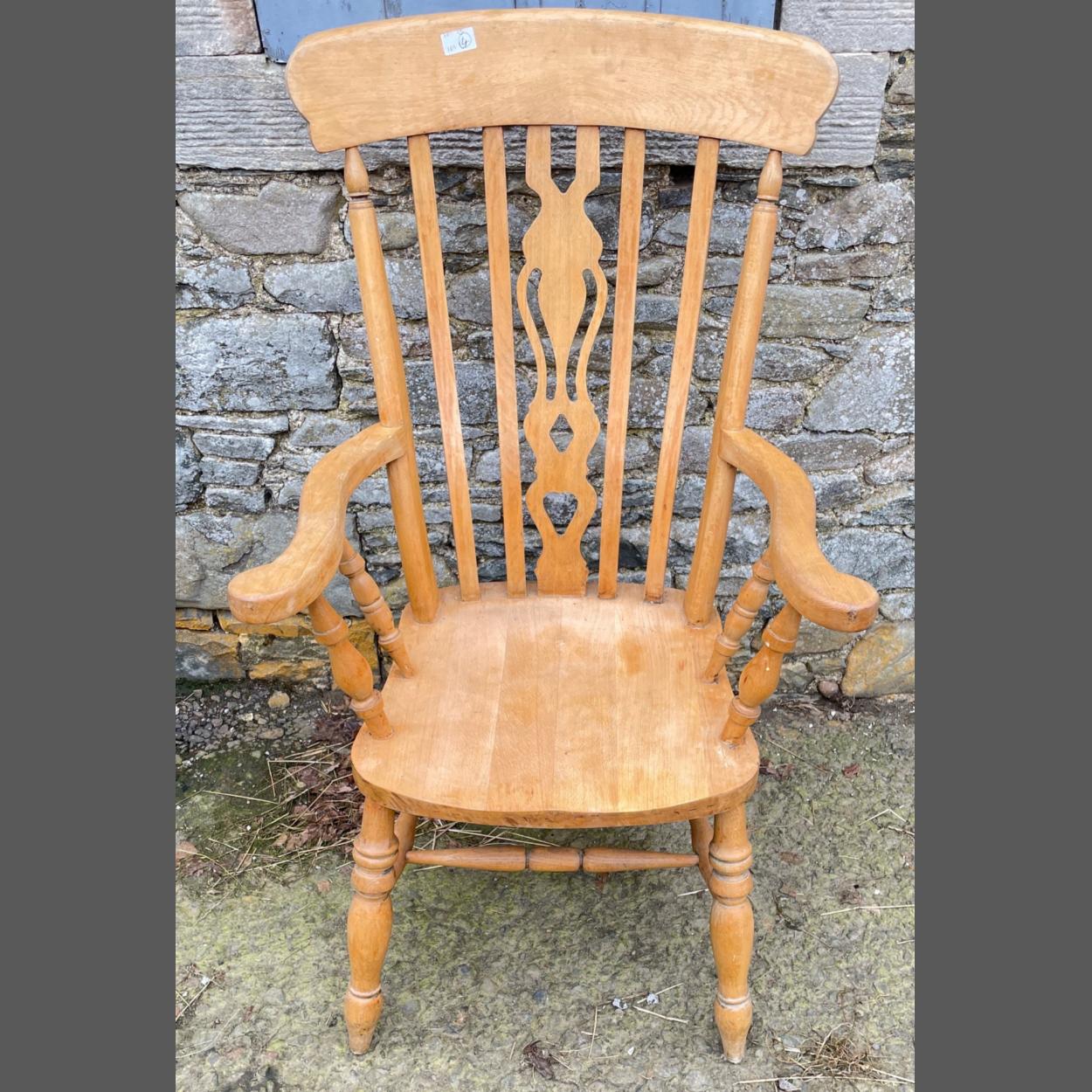A large open arm Windsor Fiddle-back beech farmhouse chair dimensions height 115cm x width 45cm x depth 51cm