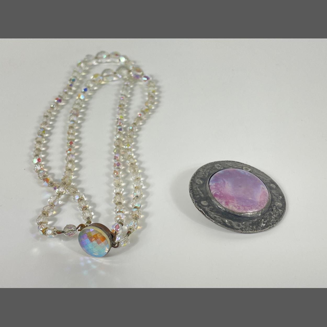 An old double strand of crystal beads necklace 50cm long with a Scottish brooch with a large agate in the centre 5.5cm diameter