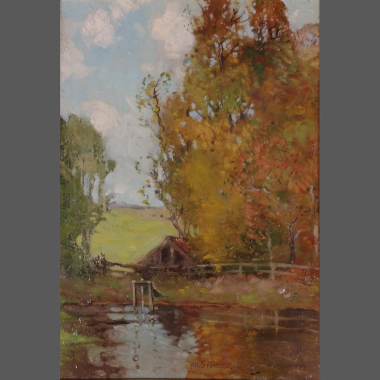 ALICK RIDDEL STURROCK 'By The Waterside' oil on board, signed and dated July 1913 - dimensions 15" x 10" (Scottish b1885 - d1953) - within a modern stylish distress-look frame