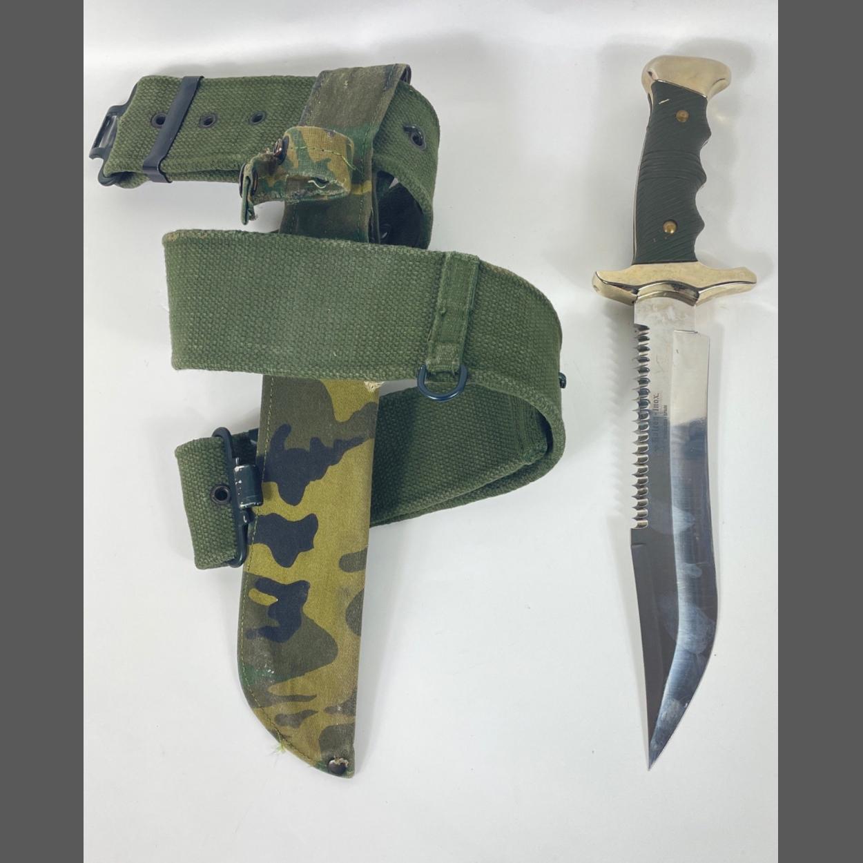 A HALCON INOX Bowie hunting knife in sheath 33cm long on a khaki canvas belt