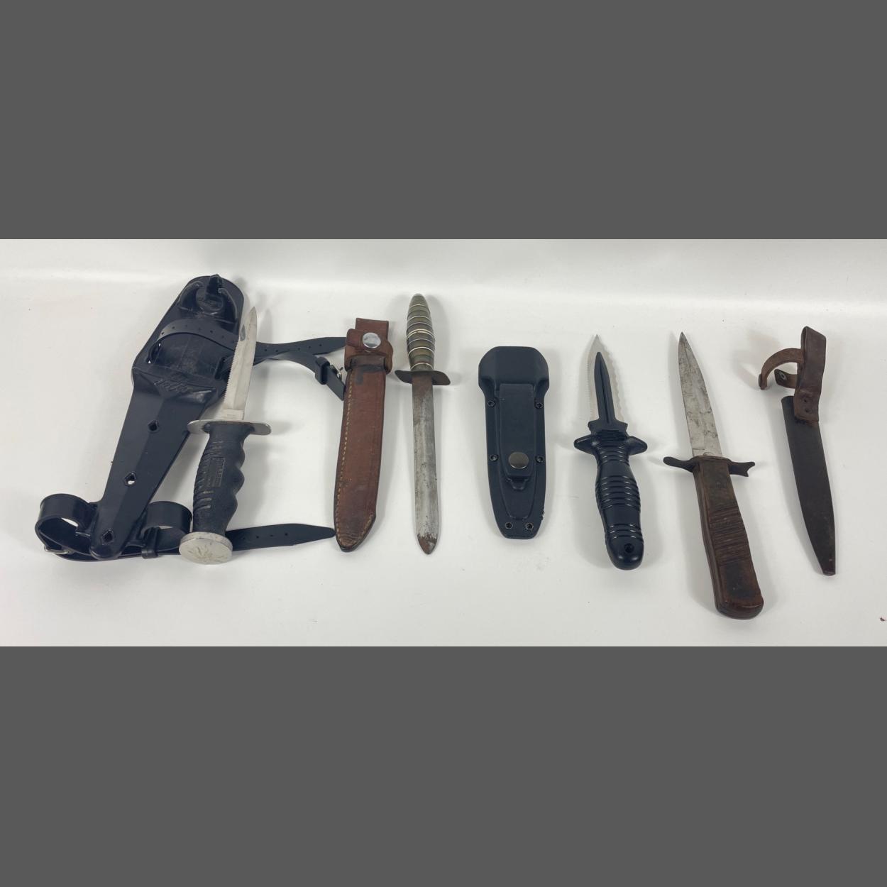 An INOX Mares Sub scuba diving knife in sheath, a Fury double serrated knife with 12cm blade plus 2 other knives
