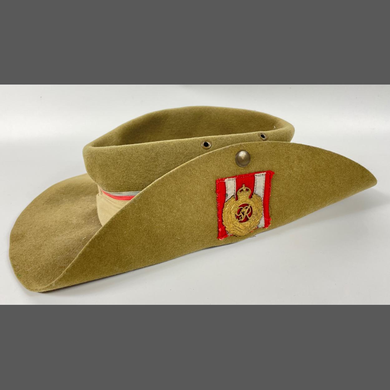 Military Headgear / Headwear. ROYAL ENGINEERS TROPICAL BUSH HAT, Khaki felt hat with turn up brim to the left side and fitted with a silk Royal Engineers pagri badge. Nice original condition, strap broken and some creasing and minor stains