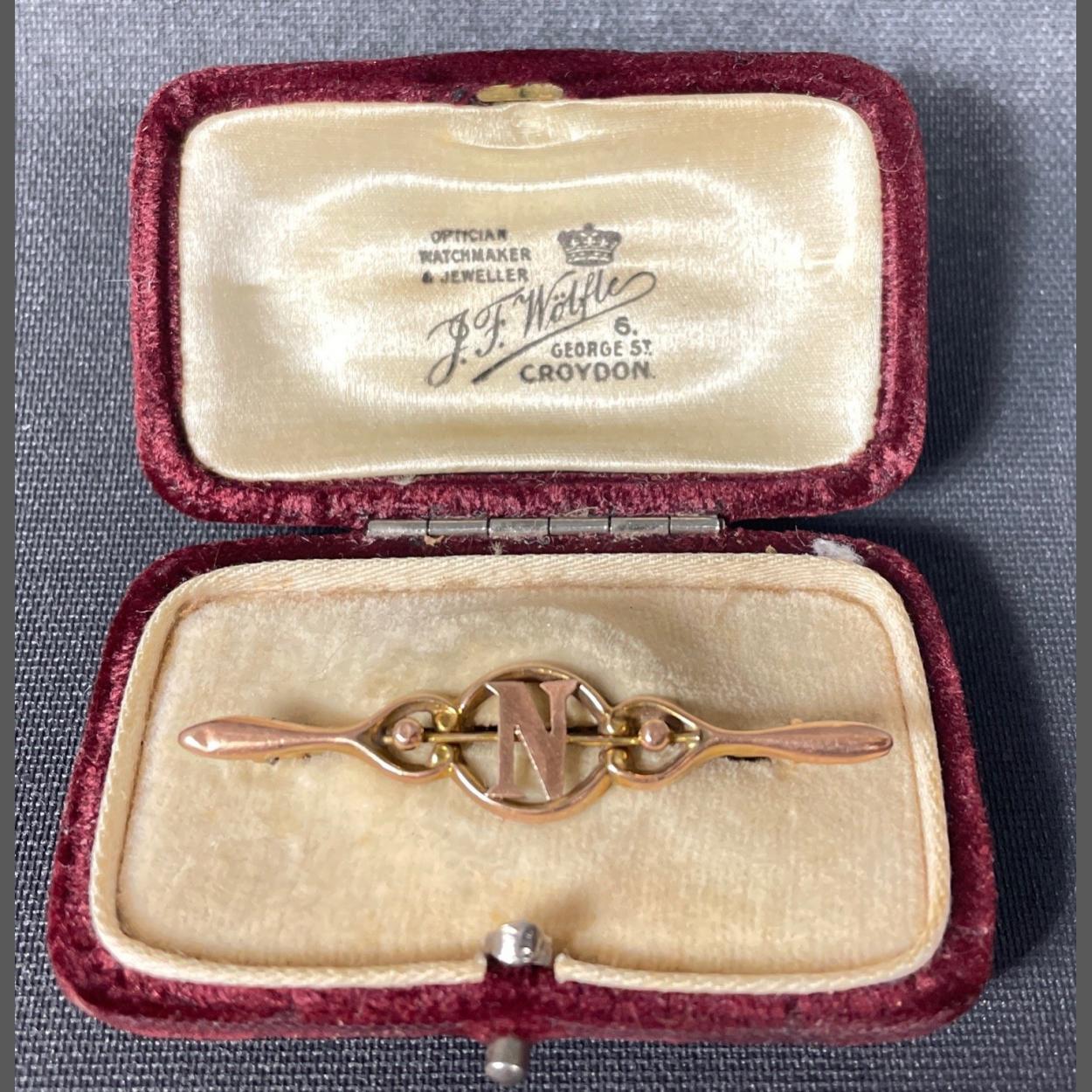 A gold bar BROOCH PIN in original Croydon Jewellers Box. Capital N Initial in Propellor shape bar, similar to sweetheart brooch but non military. Marked 9ct to rear. 50mm long. Weighs approx. 1.2g