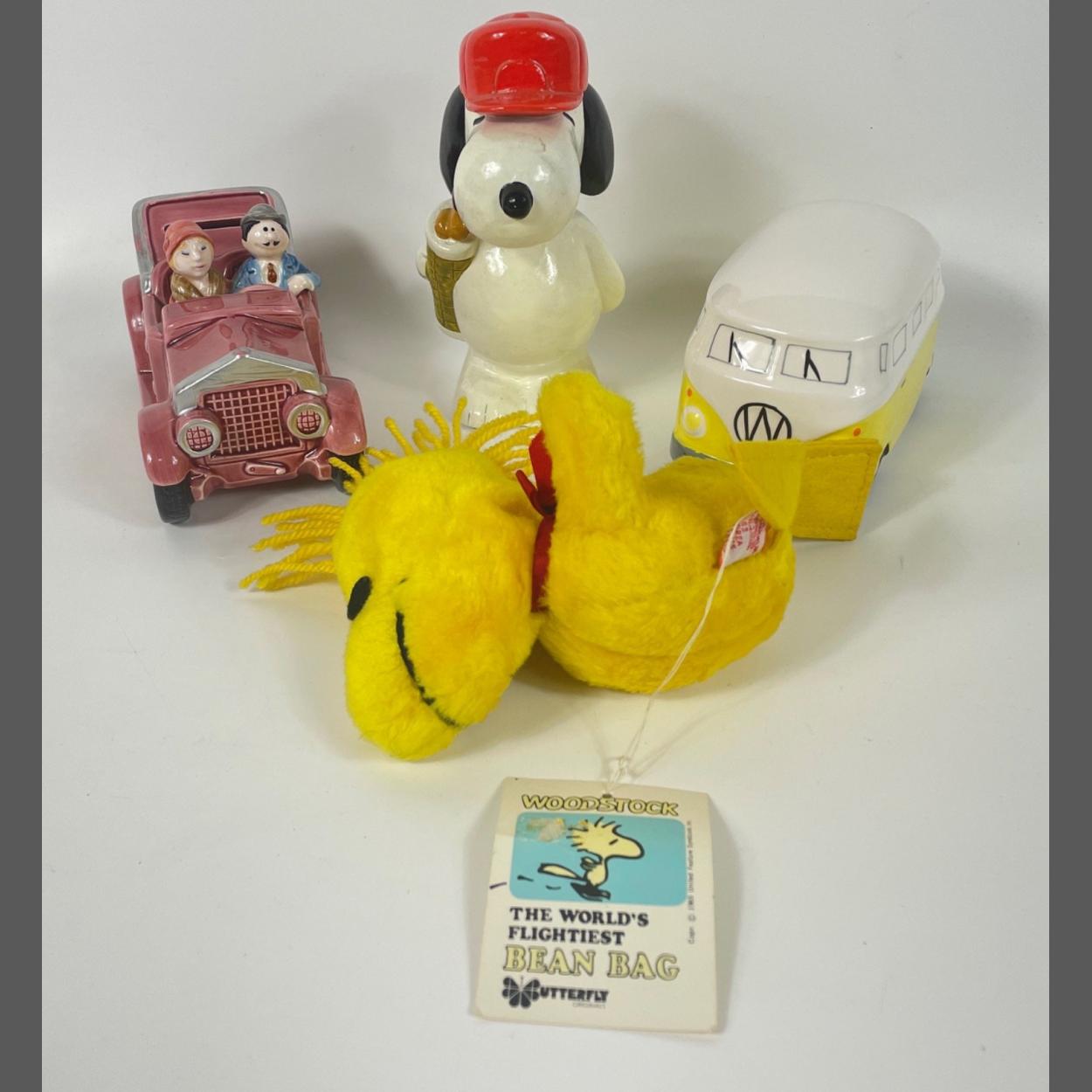 Three vintage novelty money banks including the iconic VW campervan (13x8cm), SNOOPY (17cm tall), and a couple in a vintage car (16X8cm) with a bonus WOODSTOCK bean bag still with original tag