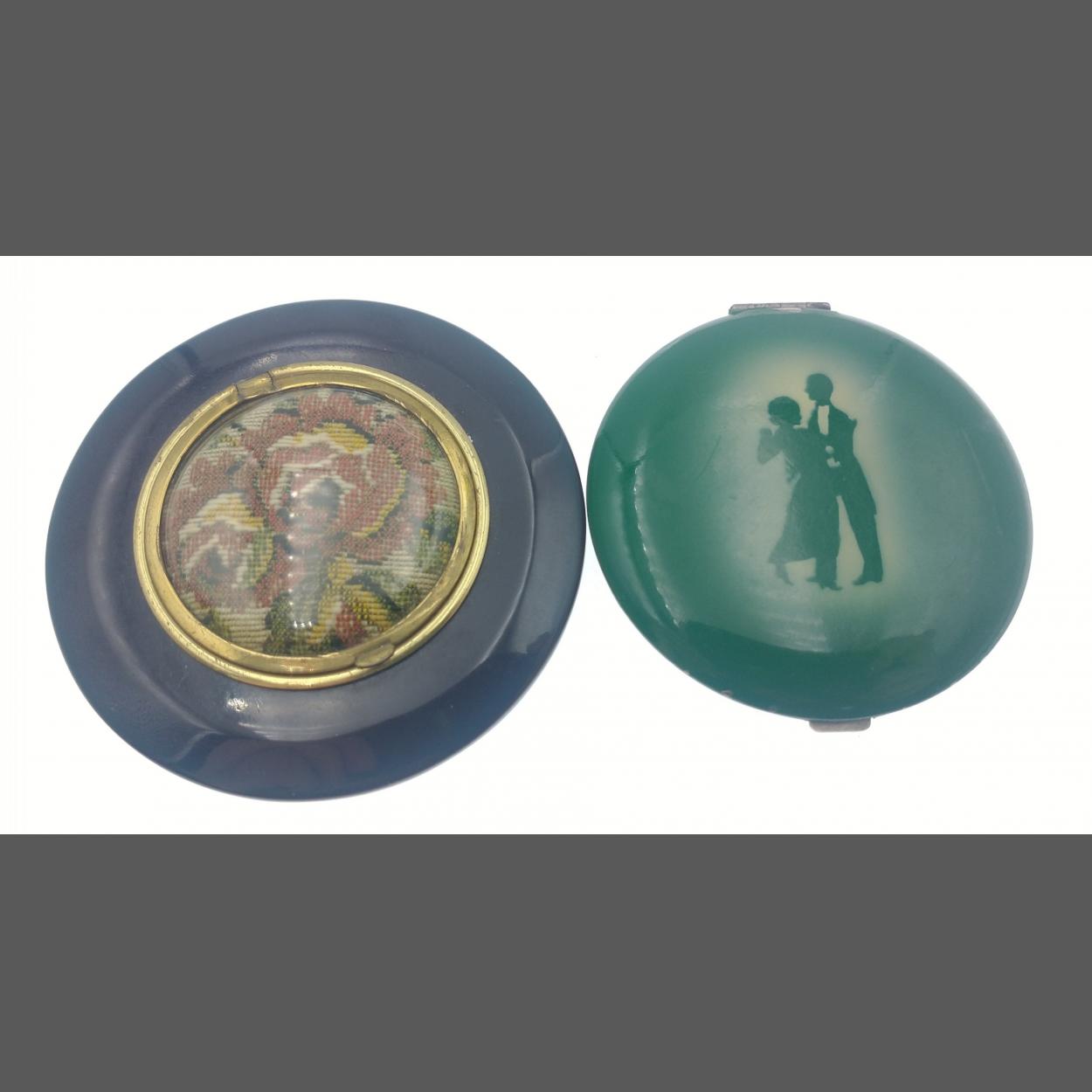 Two vintage STRATTONS NON-SPILL compacts - one in green with a dancing couple and the other black with a tapestry rose in the centre and still containing a quantity of rouge in the inner container