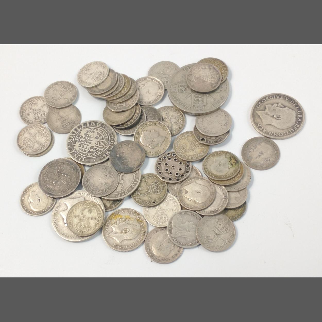 51 SILVER SIXPENCES and THREEPENCES from Victoria, Edward Vl and early George V to 1921, a Victoria 1899 Shilling, An Edward Vll one shilling, a George V 1921 Florin, An Edward Vll 1909 and George V 1914 shilling coins and one other Victoria shilling? coin 1887 - 57 approx