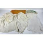 A mixed box to include a leather brandy glass holder (with glass), a green glass dish (14x14cm), a clear glass sandwich platter (23x15cm), a Q&Q ladies watch, a small oval wicker basket 16cm long plus various scarves etc, a pair of butter pats etc