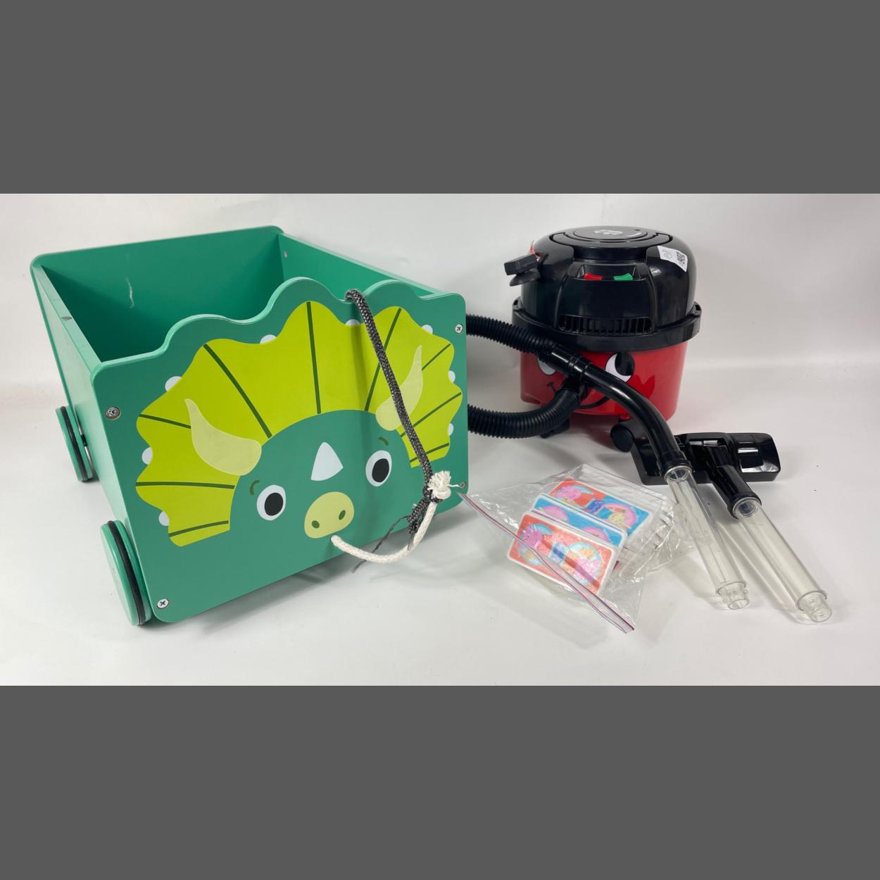 A hand-made bespoke pull-along toy box with a painted design of a friendly rhinoceros, (40x28x27cm), comes with a set of plastic Peppa Pig dominoes and a child size HENRY HOOVER by Numatic