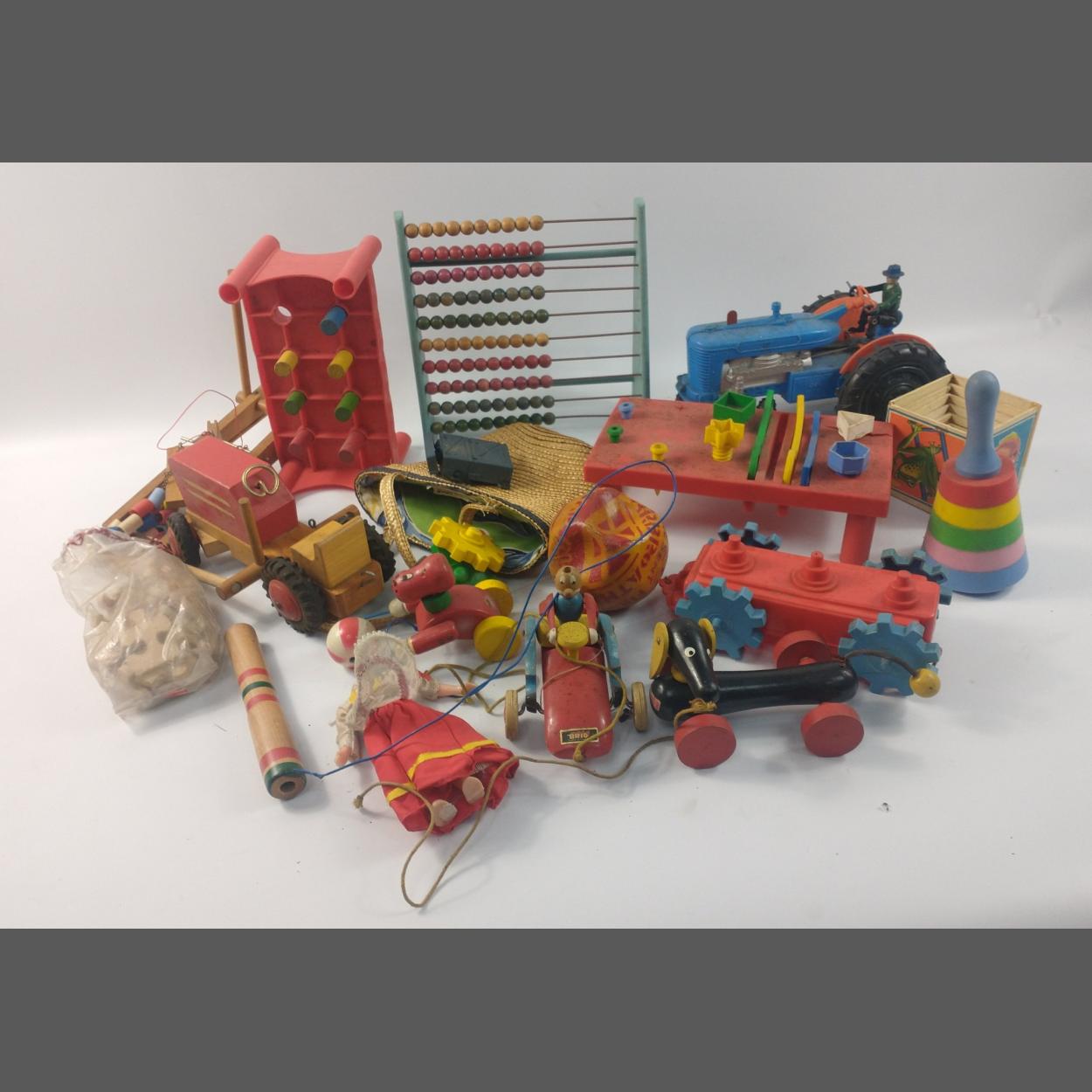 Mixed box of c1960's VINTAGE play toys to include a 'reversible battery operated blue tractor, an abacus, some wooden toys and much more!