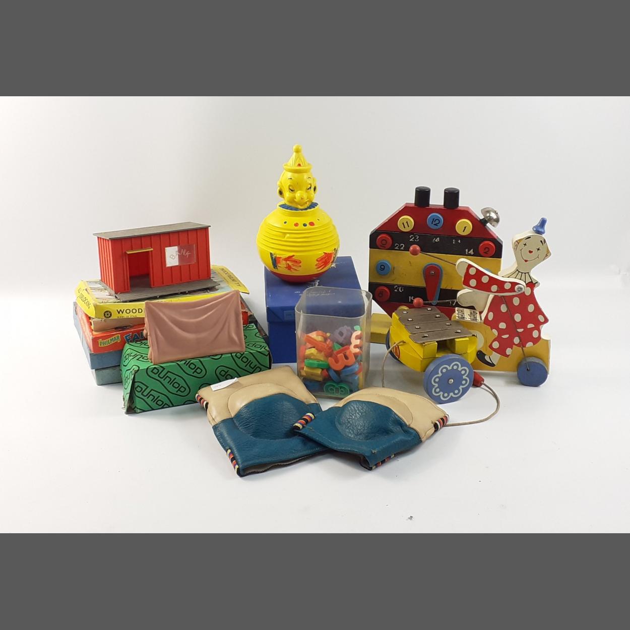 A box FULL of vintage dusty toys to include 'VICTORY ply-wood jig-saw puzzle and other jigsaws(cannot verify being intact!) and a pull-along toy etc etc