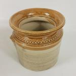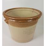 A 15lb stoneware pot made by AW BUCHAN of Portobello, and stamped to the front with JAMES LYLE, Wine merchant & Grocer, 2 Nicholson St Edinburgh stands 22cm high, 29cm diameter, has a crack down one side but it would still make a good plant holder plus one other pot made by GROSVENOR of Glasgow stands 16cm high, diameter 16cm (small chip off one handle)