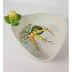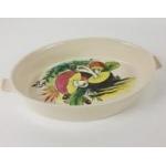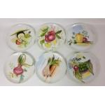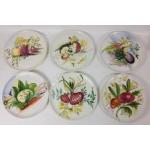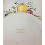 A part dinner service of hand-painted plates and serving dish, each plate is decorated with a different hand-painted vegetable, set consists of 6 side plates, by MANCIOLI of Italy, (16cm with some small chips from rim), 6 plates (22cm no chips), a lasagne dish (28cm long) and a triangular serving dish (approx 23cm dia) decorated with parsnips and a handle of a cabbage (small chip); only the side plates and lasagne dish are stamped Mancioli but the designs on the other items match these