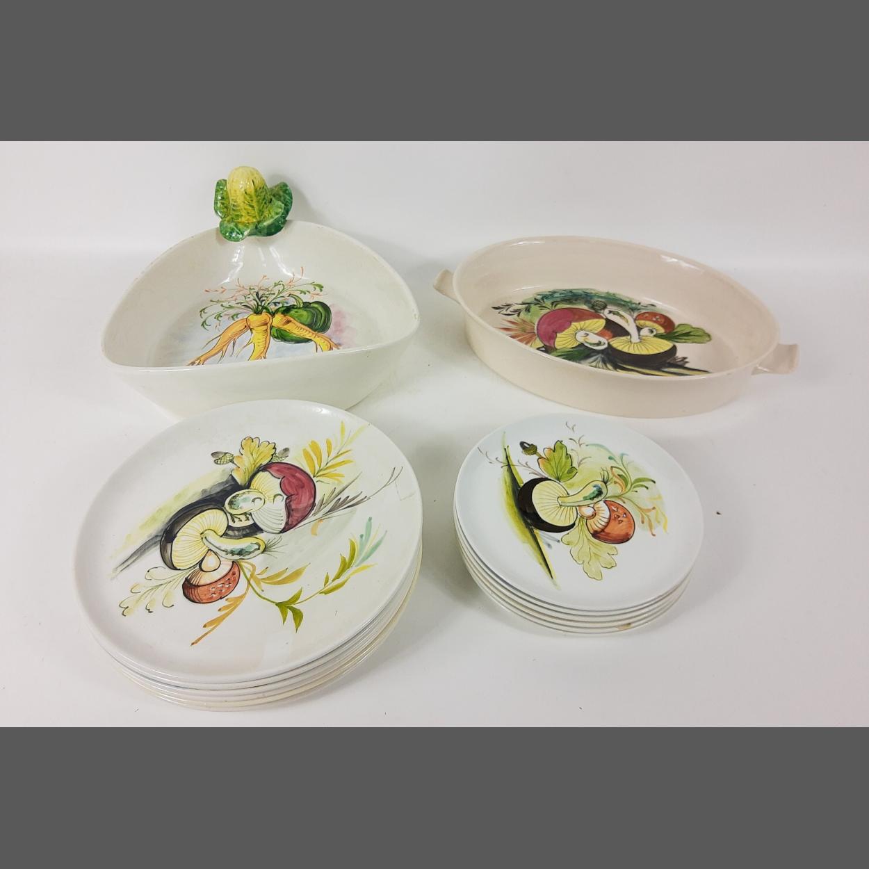 A part dinner service of hand-painted plates and serving dish, each plate is decorated with a different hand-painted vegetable, set consists of 6 side plates, by MANCIOLI of Italy, (16cm with some small chips from rim), 6 plates (22cm no chips), a lasagne dish (28cm long) and a triangular serving dish (approx 23cm dia) decorated with parsnips and a handle of a cabbage (small chip); only the side plates and lasagne dish are stamped Mancioli but the designs on the other items match these