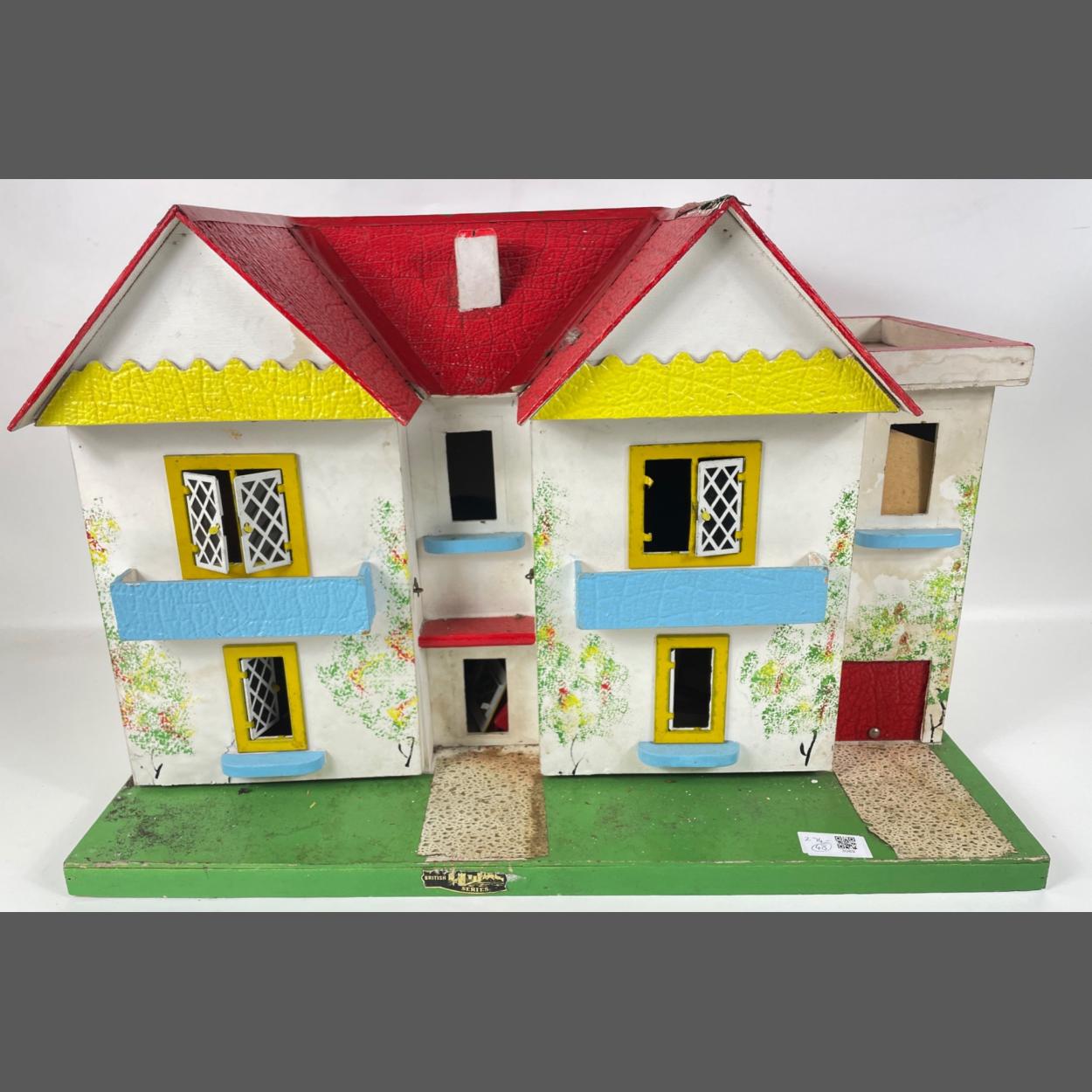 A fixer-upper - a vintage wooden doll's house in good overall condition but in need of attention to the windows and doors, comes with some furniture 60x35x40cm