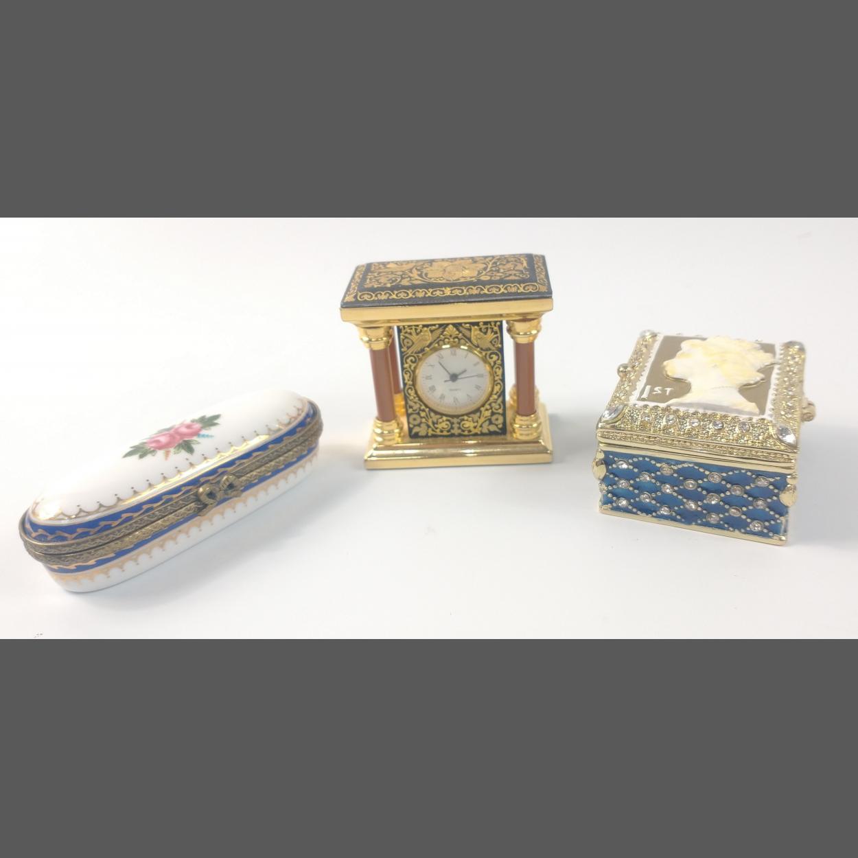 A collection of 2 small trinket boxes, one with a cameo of a 1st class stamp (5x4.5x3cm) with blue enamel and white stones, the other being ceramic with a floral design 8x3x2cm, also a miniature clock only 5x5x3cm