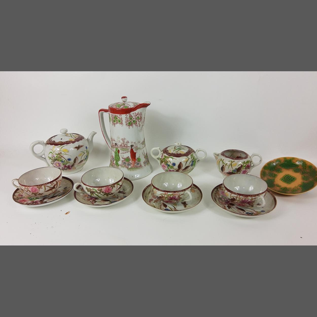 A delicate oriental tea service comprising 4 cups and saucers, 1 teapot, 1 milk jug, 1 lidded sugar bowl plus a coffeepot and 1 other plate