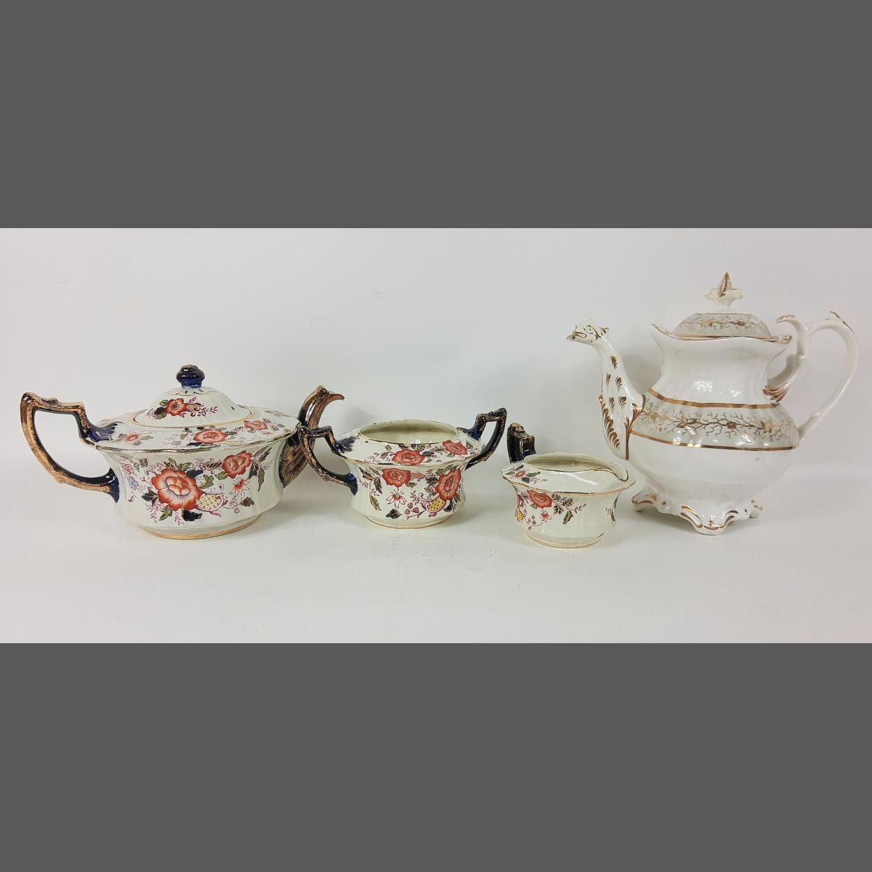 A Samuel Johnson BRITANNIA Pottery floral teapot with gilt highlight plus matching milk jug and twin-handled sugar bowl (tiny chip on rim) and an additional white with gold teapot (no maker's mark)