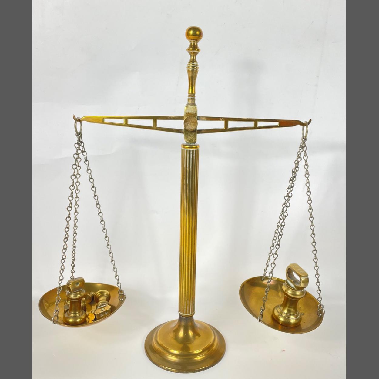 A pair of traditional brass balance weighing scales standing 48cm tall including imperial weights - 0.25oz, 0.50oz, 1oz, 2oz, 4oz, 8oz an 1lb